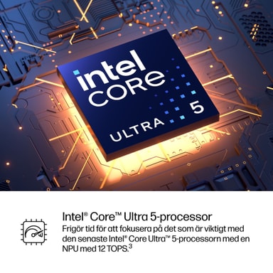 • Intel Core™ Ultra 5 225U (upp till 4,8 GHz med Intel Turbo Boost Technology, 12 MB L3 cache, 12 kärnor, 14 trådar)
