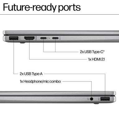 Anslutningsmöjligheter - 2x USB-A 3.2 Gen 2-port - 2xUSB-C 3.2 Gen 2-port - Supersnabb WiFi 6E, Bluetooth 5.3 - 3,5 mm kombinerad hörlurar/mikrofon ljudport