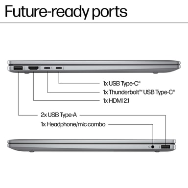 Anslutningsmöjligheter - 2x USB-A 3.2 Gen 2-port - 2xUSB-C 3.2 Gen 2-port - Supersnabb WiFi 7, Bluetooth 5.4 - 3,5 mm kombinerad hörlurar/mikrofon ljudport