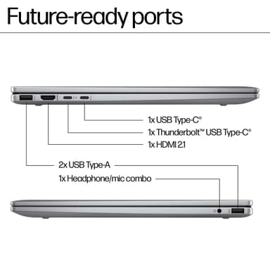 Anslutningsmöjligheter - 2x USB-A 3.2 Gen 2-port - 2xUSB-C 3.2 Gen 2-port - Supersnabb WiFi 6E, Bluetooth 5.3 - 3,5 mm kombinerad hörlurar/mikrofon ljudport
