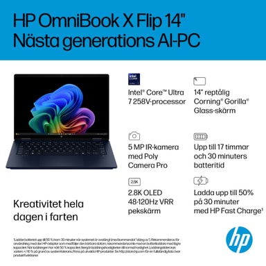 HP OmniBook X Flip 14 Ultra 7-258V/32/512/OLED 14" Copilot+ PC kombinerar en AI-driven Intel Core Ultra 7-processor, en imponerande 14" 2,8K OLED pekskärm och mångsidiga lägen i en smidig, lätt design för kreativitet på språng.Läs mer om produkten