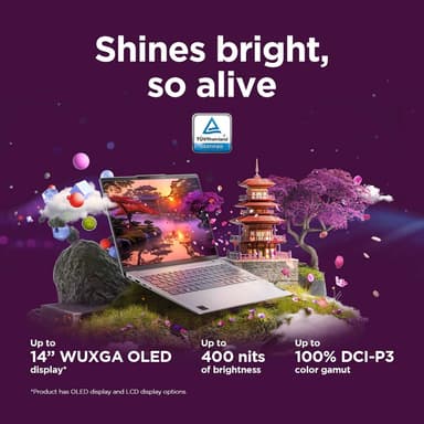 Vassare. Ljusare. Bättre. Fördjupa dig i en värld av fantastisk bild med IdeaPad Slim 5x:s 14-tums OLED-skärm. Med ett bildförhållande på 16:10, 400 nits ljusstyrka och smala ramar för ett förhållande på 90 % aktiv yta är den här skärmen en fröjd för ögonen. 100 % DCI-P3-omfång och skarp WUXGA-upplösning ger liv till varje bild med levande, exakta färger. Dessutom minimerar Super Resolution AI-tekniken fördröjning, vilket ger en sömlös tittarupplevelse, medan funktionen för lågt blått ljus säkerställer att dina ögon förblir bekväma under långvarig användning.