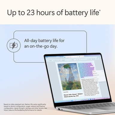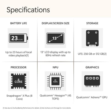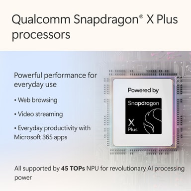 Surface Laptop är byggd med de senaste Qualcomm Snapdragon X Plus-processorerna (8 kärnor), ger en imponerande prestanda och har en NPU med upp till 45 TOPS som utformats för att ta dina AI-upplevelser till nästa nivå.