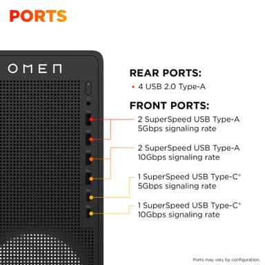 Anslutningsmöjligheter OMEN 16L stödjer Wi-Fi 6 (802.11ax) och Bluetooth 5.4, vilket säkerställer snabb och pålitlig anslutning. Med HDMI, DisplayPort, flera USB-A och USB-C-portar kan du enkelt ansluta alla dina tillbehör och kringutrustning för att förbättra din spelupplevelse.