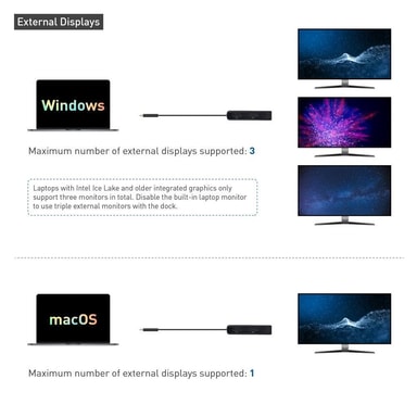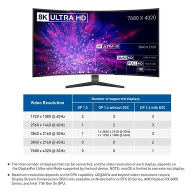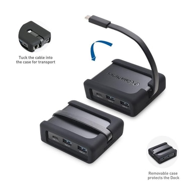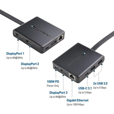 Cable Matters 1 till 8 dockningsstation omvandlar en USB-C eller Thunderbolt 3/4 port till 8 portar inklusive 3xDisplayport, 1xUSB-C PD100W, 2xUSB-C 5Gbps, 2xUSB-A 3.1 5Gbps och 1xRJ45 Giga LAN.