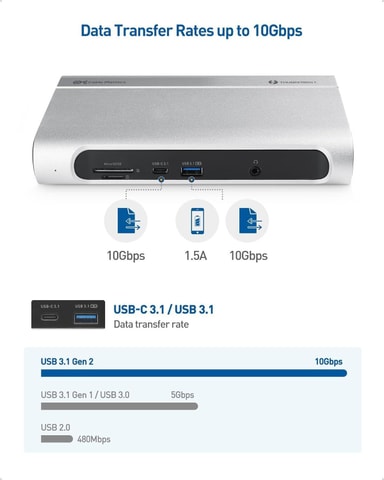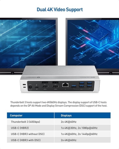 Cable Matters 14-portars Thunderbolt 3-dockningsstation konverterar en Thunderbolt 3-port i din dator till 2x HDMI eller Displayport, 1x RJ45 Lan, 5x USB-A 3.0, 1x SD-kortplats, 1x MicroSD-kortplats, 1x USB-C 3.2 Gen 2, 1x USB-A 3.2 Gen 2 och 1x 3,5 mm AUX. Dockningsstationen stöder två externa bildskärmar i upplösningar upp till 4k60Hz via antingen Displayport eller HDMI och båda kan utöka och spegla datorns skrivbord (Endast Intel Mac-datorer stödjer två bildskärmar). USB 3.2 Gen 2-portarna stöder dataöverföringshastigheter upp till 10 Gbps och USB 3.0-portarna stöder dataöverföringshastigheter upp till 5 Gbps. Det är möjligt att ansluta datorn till trådbundet internet via RJ45-porten som stöder gigabit ethernet. Både SD- och MicroSD-kortplatserna stöder 300 MBps dataöverföring och 3,5 mm AUX-porten kan användas för både hörlurar och en mikrofon. Dockningsstationen kräver inga drivrutiner och den kan även låsas med ett Kensington-lås.Specifikationer: