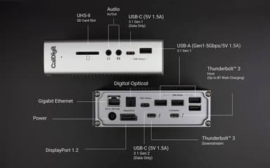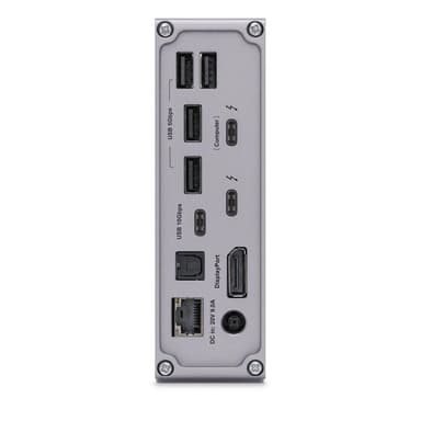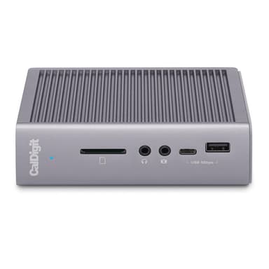 Dockningsstationen CalDigit TS3 Plus ansluts via en av Thunderbolt 3-portarna på din dator och erbjuder upp till 15 extra utbyggnadsportar. Den erbjuder inte bara fler anslutningsmöjligheter, utan den laddar även din bärbar – allt med en enda kabel.