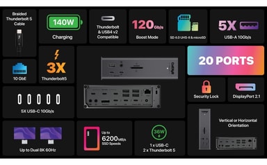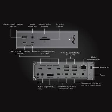 SpecifikationerAntal portar: 20Thunderbolt 5: 1× värdport (120Gb/s), 2× nedströmsportar (80Gb/s)USB: 5× USB-C (10Gb/s), 5× USB-A (10Gb/s)Display: 1× DisplayPort 2.1, stöd för upp till 3 skärmar på WindowsEnkel skärm: upp till 8K 60Hz (Thunderbolt 5/USB4)Dubbel skärm: upp till 5K 60Hz per skärmTrippel skärm (Windows): upp till 4K 144HzLagring: SD 4.0 (UHS-II), microSD 4.0 (UHS-II)Nätverk: 10 Gigabit EthernetLjud: 1× front 3,5mm combo, 1× bakre ljud ut, 1× bakre ljud inStrömförsörjning: upp till 140W till värdenhet, 36W via Thunderbolt/USB-C, 7,5W via övriga portarMått: 155 × 47 × 127,9 mmVikt: 0,90 kgFunktioner20 portar som kan användas samtidigt140W laddning för kraftfulla laptops som MacBook Pro 16″ M3/M4 Pro/MaxStöd för upp till tre externa skärmar med hög upplösning och hög uppdateringsfrekvensBandwidth Boost prioriterar bildskärmar med hög prestanda10GbE för blixtsnabba nätverkshastigheter64Gb/s PCIe-prestanda för externa SSD:er upp till 6 200MB/sTvå separata USB-kontrollers för maximal överföringskapacitetSD och microSD UHS-II kortläsare med hög hastighetOffline-laddning för mobila enheter även utan ansluten datorKompatibel med macOS, Windows och iPadOS (Thunderbolt/USB4)Innehåll1× CalDigit TS5 Plus1× Thunderbolt 5-flätad kabel (1m)2× gummifötter1× strömkabel1× 330W nätadapter