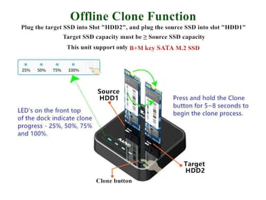 Offline cloning innebär att K3016S inte behöver anslutas till en dator. Anslut bara strömmen och tryck på knappen så kan du säkerhetskopiera din viktiga data från disk 1 till disk 2. Det går även att kopiera från HDD i PC direkt till Disk 1 eller disk2. Dokningsstationen har stöd för att kopiera både datadiskar och systemdiskar. Upp till 4TB HDD. USB 3.2 Gen1 stödjer upp till 5Gbps. Det går även att kopiera filer från HDD i dator till disk 1 eller disk 2.