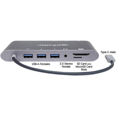 Manhattan Notebook-dockningsstation Passar till följande märken: univerzálny inkl. laddningsfunktion-låsIngång: 1 x USB Typ-C-kontakt · Utgångar: 1 x HDMI-uttag · 1 x mini displayport-uttag · 1 x VGA-uttag · 1 x Gigabit-RJ45-uttag (10/100/1000Läs mer om produkten