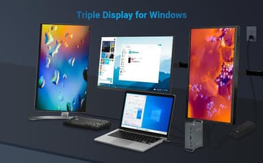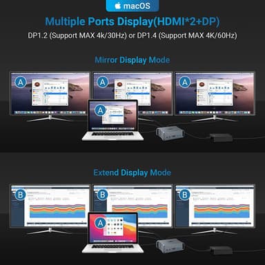 Dockningsstationen har stöd för upp till tre externa monitorer, två via HDMI och en via Displayport. Upplösningen för en monitor är max 4k60hz, för två är det 4k30hz och för tre så är det 2k60hz. Dockningsstationen har också stöd för MST vilket innebär att man den både kan spegla (mirror) eller utvidga (extend) de externa monitorerna. Extended fungerar bara på Windows.