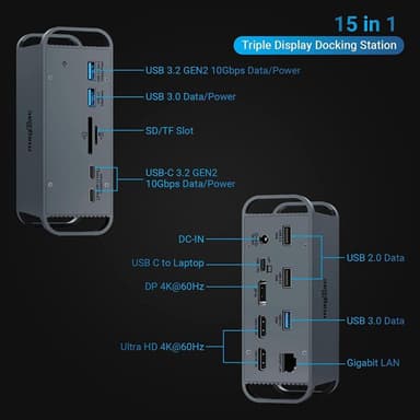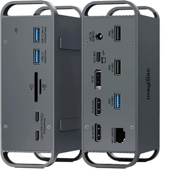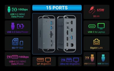NÖRDIC 1 till 15 USB-C dockningsstation låter dig expandera en USB-C port i din dator till 2xHDMI 2.0, 1x DP 1.2, 1xUSB-C 3.2 Gen2, 1xUSB-C Power delivery 65W, 1xUSB-C 3.0, 2xUSB-A 3.2 Gen2, 1xUSB-A 3.0, 2xUSB-A 2.0, 1xRJ45, 1xDC in, 1xSD korts ingång, 1xTF korts ingång.