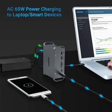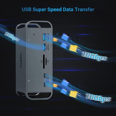 De tre USB 3.2 Gen2 portarna har stöd för dataöverföringshastigheter upp till 10Gbps, USB 3.0 portarna har stöd för hastigheter upp till 5Gbps och USB 2.0 portarna har stöd för hastigheter upp till 480Mbps. Använd 65W DC in porten för att strömförsörja både dockningsstationen och din dator via USB-C PD porten och anslut trådat internet via RJ45 porten.