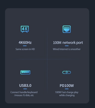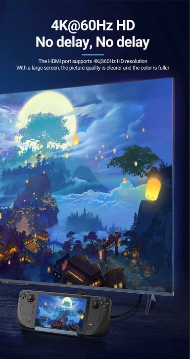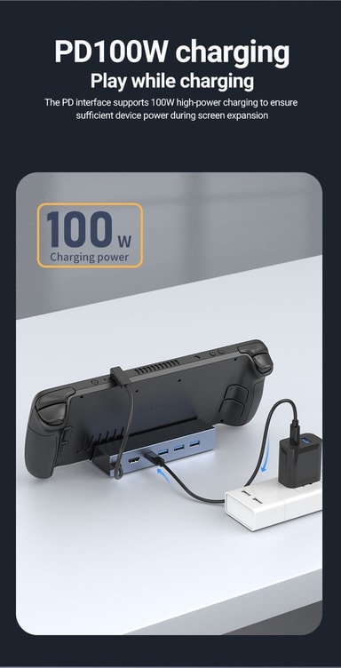 NÖRDIC USB-C 1 till 6 Dockningsstation för Steam Deck omvandlar USB-C porten på din Steam Deck till 1x HDMI 2.0, 1x USB-C Power delivery, 3x USB-A 3.0 och 1x Rj45 Lan 100 Mbps. HDMI 2.0 porten har stöd för upplösningar upp till 4k60Hz och USB 3.0 portarna har stöd för dataöverföringshastigheter upp till 5 Gbps. Det går att ansluta din Steam Deck till 100 Mbps trådat internet via RJ45 porten på dockningsstationen och det går också att ladda den med upp till 100W via USB-C porten. Dockningsstationen har också en hållare för din Steam Deck för att undvika oönskade rörelser. Dockningsstationen kräver inga drivrutiner eller extern strömförsörjning.Specifikationer: