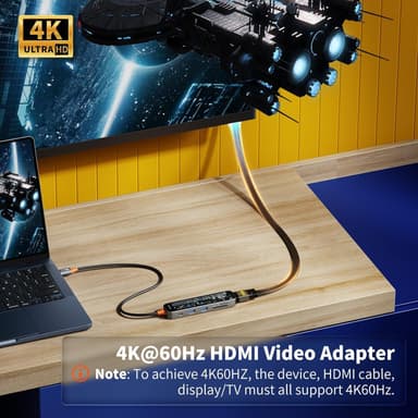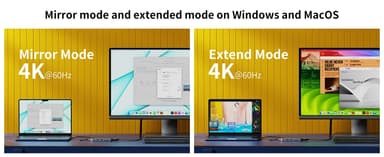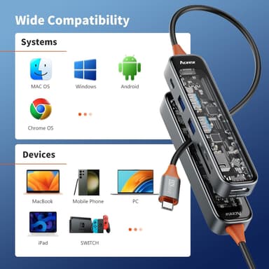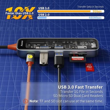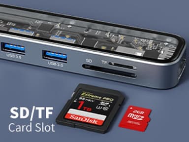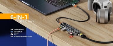 Denna 6 i 1 USB-C hubb låter dig omvandla en USB-C port i din dator till 2x USB-A 3.1 5Gbps, 1x HDMI 2.0 4K60Hz, 1x SD minneskortplats, 1x TF minneskortplats (OBS: SD och TF minneskortplatser kan inte användas samtidigt) och en USB-C PD 100W. Hubbens HDMI stöder både MIRROR-läge och EXPANDED-läge och kan strömma upplösningar upp till 4K60Hz (se till att din dator stöder DisplayPort 1.4. Om din dator endast stöder DisplayPort 1.2 kommer HDMI-adaptern bara nå 4K30Hz).