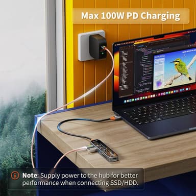 USB C-porten ger upp till 100W strömförsörjning till din laptop eller andra mer effektkrävande anslutna enheter, ingen dataöverföring. Använd kabel som klarar mer än 65W för säkert bruk (ej inkluderat).