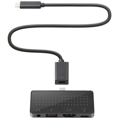• StayGo Mini ansluter diverse portar till MacBook, iPad, iMac, fyra portar: Hörlurar (teleplugg), USB-A, HDMI, USB-C (Power pass-through), pass-Through