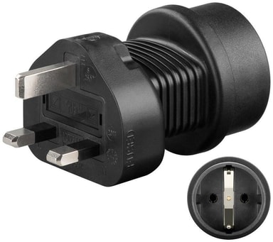 Praktisk reseadapter för att ansluta elektriska apparater med stickkontakt med skyddsjord (typ F) till det brittiska elnätet (typ G)