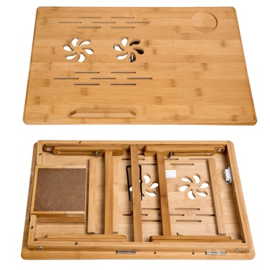 Detta praktiska laptopbord underlättar din arbetsdag och höjer kvaliteten på din fritid. På så sätt kan du arbeta, surfa, spela eller chatta bekvämt i sängen eller soffan. Arbetsytan är lutbar och hela bordet kan justeras i höjdled, för att du ska kunna ställa in bordet individuellt efter önskad position. Laptopstödet är tillverkat i stabilt och elegant bambuträ och är glanslackerat. Som extra finess har laptopbordet en inbyggd dubbel kylfläkt med USB-anslutning.