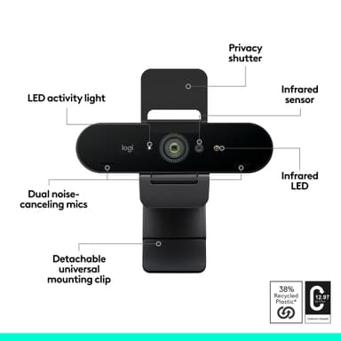 Logitech Brio webbkamera säkerställer smidiga onlinemöten med sin 4K-upplösning i 30 fps och 5x digital zoom. Den har en inbyggd mikrofon och stöd för Windows Hello för säker ansiktsigenkänning vid inloggning.Läs mer om produkten