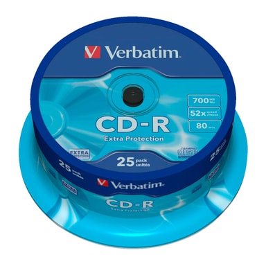 Verbatim CD-R låter dig bränna 700 MB data eller 80 minuter musik med upp till 52 gångers hastighet. Varje skiva har Extra skyddslager för att förhindra förlust av data. Boxen innehåller 25 CD-R skivor.Läs mer om produkten