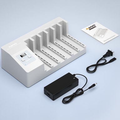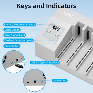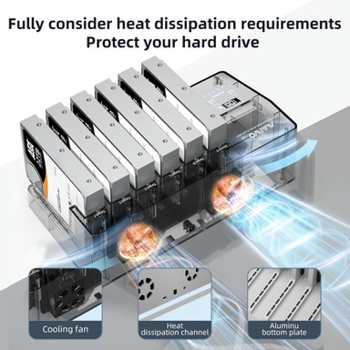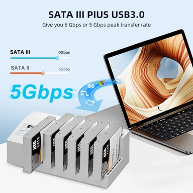 Maiwo K3096C är den ultimata HDD kloning- och dockningsstationen som låter dig ansluta upp till sex olika hårddiskar till din dator samtidigt för upp till 132TB externt lagringsutrymme. Du kan även klona från en till fem hårddiskar utan datoranslutning. Enheten har en USB 3.0 Type-C port för anslutning till en dator och sex platser för SATA 2,5"" SSD/HDD diskar eller 3,5"" HDD. Du kan ansluta till din dator med medföljande USB-C eller USB-A kablar. Enheten har stöd för offline cloning vilket betyder att du kan kopiera från källdisken till targetdiskarna utan att ansluta dockningsstationen till en dator. Enheten drivs av den inkluderade 12V 7A nätdelen. Kompatibel med Windows, MacOS samt Linux. Max stöd 8TB per lagringsenhet, byggd av aluminium för bästa värmeavledning. Automatisk inbyggd fläktkylning och enheten kräver inga drivrutiner eller verktyg för installation.Specifikationer: