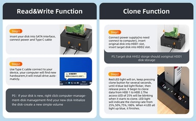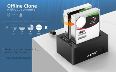 MAIWO K3082C USB 3.1 SATA HDD Dockningsstation låter dig ansluta två 2,5 ""eller 3,5"" SATA-hårddisk till din dator via USBC port. Det är ett kraftfullt produkt för dataöverföring, säkerhetskopiering och kloning. Med Superspeed USB 3.1 erbjuder det en dataöverföringshastighet upp till 10Gbps. Det är tjugo gånger snabbare än USB 2.0-hastigheten på 480 Mbits. Medföljande strömadapter levererar stabil ström för en säkrare HDD funktion.