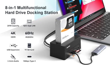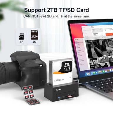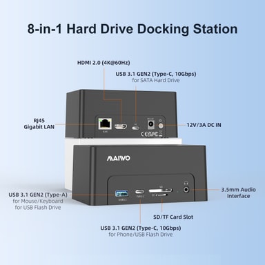 Maiwo K308P är en kombination av en extern lagringskabinett och en dockningsstation. Den låter dig ansluta två 2.5"" eller 3.5"" SATA I/II/III HDD eller SSD med upp till 20TB lagringsutrymme till din dator via USB-C 3.1 Gen 2. Utöver det har den portar för SD-minneskort och TF-minneskort upp till 2 TB, observera att man inte kan läsa SD och TF samtidigt.