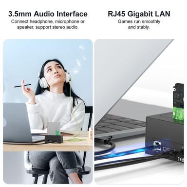 Kabinetten har, utöver USB-C anslutning till din dator, en USB-A 3.1 och en USB-C 3.1 för anslutning av tangentbord, telefon, USB-minne etc och bägge USB-portar har stöd för dataöverföringshastigheter upp till 10 Gbps och är bakåtkompatibel med tidigare USB versioner. Utöver lagring kan du även ansluta en extern skärm till din dator via HDMI 2.0 porten som stöder upplösningar upp till 4K60Hz. Dockningsstationen kommer även med en port för 3.5mm AUX och RJ45 Ethernet port som stöder 1 Gbps nätverksanslutning. Kabinetten drivs av medföljande 36W nätdel som har stöd för överström-, överspänning- och kortslutningsskydd. Inga drivrutiner krävs, plug & play.Specifikationer: