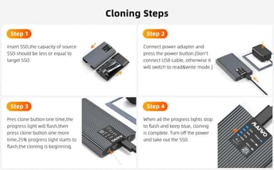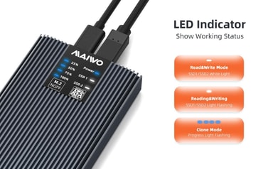 Maiwo K2022S extern kabinett låter dig både läsa och skriva till två externa M.2 SATA SSD samtidigt med en överföringshastighet på upp till 5 Gbps. Kabinetten har också stöd för offline cloning vilket låter dig överföra och säkerhetskopiera din data utan att att använda en dator.
