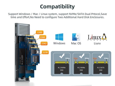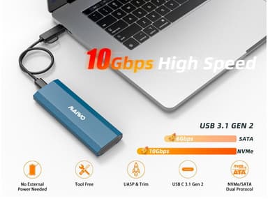Maiwo K1690 är en unik extern kabinett som har stöd för både M2. SATA och M2. NVMe SSD. Med USB3.2 Gen2 gränssnitt kan man överföra data upp till 10Gbps (NVMe) och 6Gbps (SATA). Max SSD 2TBSpecifikationer: