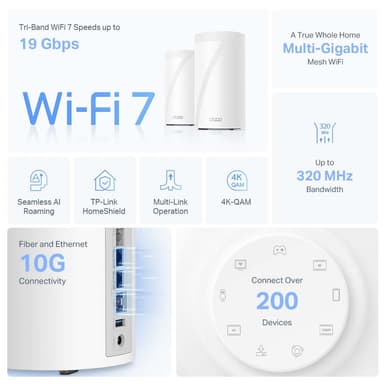 TP-Link Deco BE85 WiFi 7 mesh-system (1-pack) erbjuder stabil och pålitlig internetanslutning för över 200 enheter med oöverträffade hastigheter tack vare WiFi7. Systemet har 10 Gbps fiber och metallisk anslutning.Läs mer om produkten