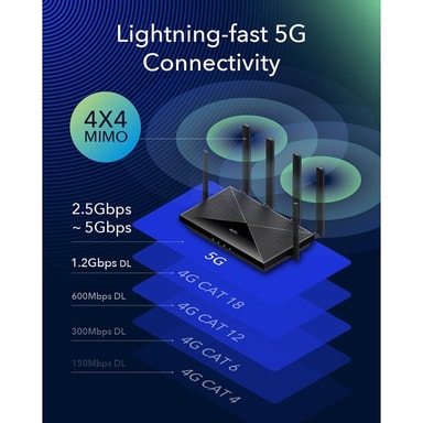P5 ger 5G-topphastigheter på 2,4 Gbps (DL/SA) och 900 Mbps (UL/SA), perfekt matchande den mäktiga 3000 Mbps dual-band Wi-Fi 6 för 4K-streaming. P5 stöder även Mesh-teknik för att nå omfattande täckning. VPN och DNS över TLS möjliggör säker anslutning via offentliga nätverk.