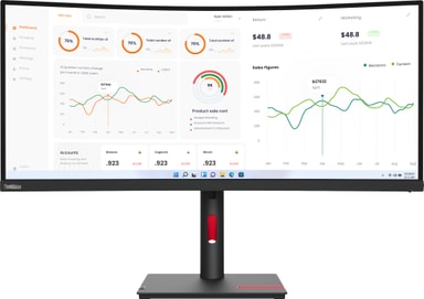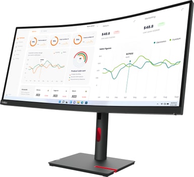 Gör dig redo att ta din effektivitet till nästa nivå med den uppslukande, krökta 34"-bildskärmen ThinkVision T34w-30, som har en WQHD-upplösning på 3 440 × 1 440 och NearEdgeless-design på tre av sina sidor för att du inte ska missa en enda detalj. Bildförhållandet 21:9 ger en panoramaupplevelse och 1500R-krökningen ger ett konsekvent avstånd mellan ögonen och skärmen. Tack vare den stora bildytan och krökningen går det lätt att visa upp även de små detaljerna för teamet, plus att det förbättrar ditt fokus och din produktivitet. Den här bildskärmen är en fröjd för ögonen tack vare de naturliga, livfulla färger som färgspektrumet på 99 % sRGB ger. Med sin Natural Low Blue Light-teknik skyddar den även din syn mot skadligt blått ljus utan att färgerna förvrids.