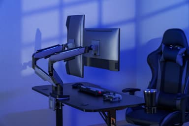 Essentials Heavy-Duty RGB dubbel monitorarm ger pålitligt stöd och flexibilitet till ditt skrivbord. Vrid, rotera och njut av flexibiliteten, den är kompatibel med 100x100 eller 75x75 VESA-standarder för enkel installation.Läs mer om produkten