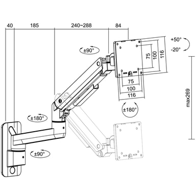 Detta kraftiga väggfäste för bildskärm med gasfjäderarm är perfekt för att spara skrivbordsyta och öka arbetskomforten. Inbyggda gasfjädrar för smidig rörelse: tillverkad av slitstarkt stål och aluminium för att stödja bildskärmar upp till 49"".