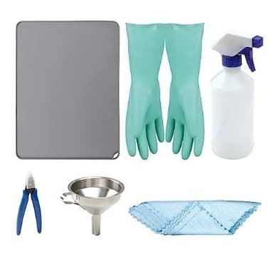 Rengöringsset för hartstryck. Den levereras med 1 silikondyna för substrat, tratt med filter, skrapa, silikonhandskar, sprayflaska och 5 våtservetter.Läs mer om produkten