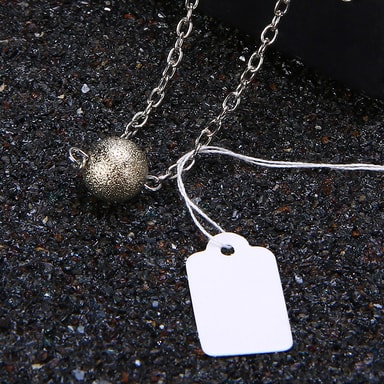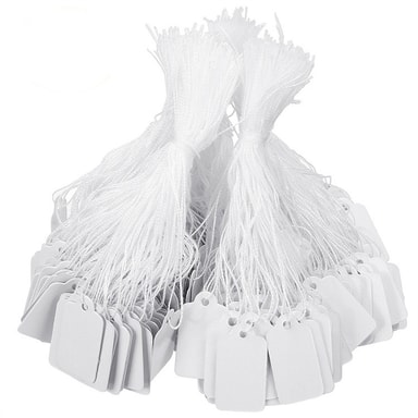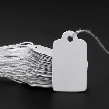 Etiketter med snöre: Dessa tags levereras i storpack om 100 st och är klara att användas. Med bandet kan du enkelt fästa etiketten på olika föremål.