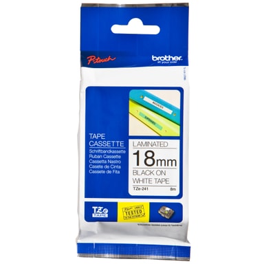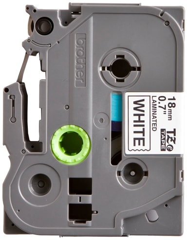 Skapa synliga vita etiketter med svart text med din Brother etikettskrivare när du använder Brother TZe märktejp. Den laminerade märktejpen har en bredd på 18 mm och är 8 lång.Läs mer om produkten