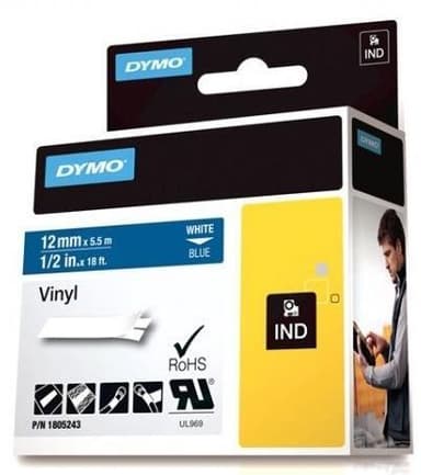 DYMO Rhino Professional, märkbar permanent vinyltejp, 12mm, vit text på blå tejp, 5,5mLäs mer om produkten