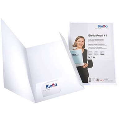 Biella Presentationsmapp 1554126 Vit 1 stPresentationsmappMått: 22,5 x 31,5 cm (B x H) · Användning för pappersstorlek: DIN A4 · Pappersvikt: 240 g/m² · Max. Antal ark: 50 ark. (80 g/m²) · Material: Kartong · Färg: vit · Matt, lamineratLäs mer om produkten