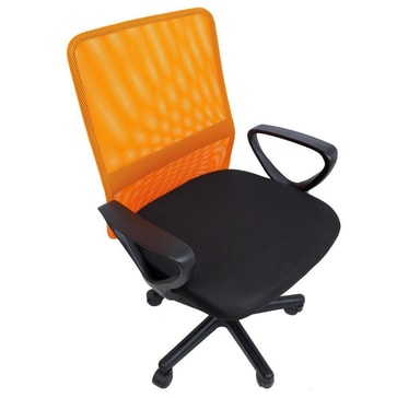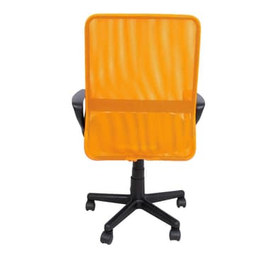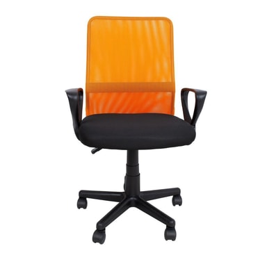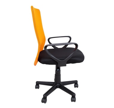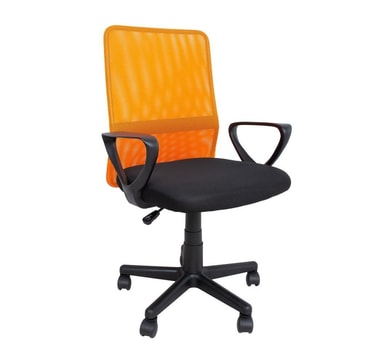 Arbetsstol BELINDA svart/orange. Den lätt klädda sitsen är klädd med polyesterväv, ryggstödet är klädd med polyester nättyg. Pneumatisk sitshöjdjustering. Svarta armstöd i plast. Svart 5-stifts plastfot, R27cm. Hjulen är gjorda av plast, 50mm. Höjd 86,5-98,5cm, sittbredd 46,5cm, sittdjup 46,5cm, ryggstödsbredd 44cm, ryggstödshöjd 55,5cm. Måtten på produkten är 59x56xH86,5-98,5cm. Viktkapaciteten är 80 kg.