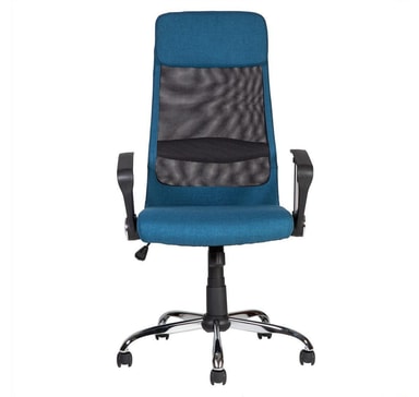 Arbetsstol DARLA blå. Stolen är klädd med blått polyestertyg och polyesternät. Stolen har lutningsmekanism, pneumatisk sitshöjdjustering. Armstöden är gjorda av metall och plast. Basen är gjord av metall, färg: krom. Stolen har plasthjul, D50mm, stift: 11mm. Höjd 116-126cm, sitthöjd 46-56cm. Måtten på produkten är 62x63xH116-126cm. Viktkapaciteten är 120 kg.