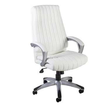 Arbetsstol ELEGANT vit. Stolen är klädd med vitt konstläder. Ramen är silver. Stolen har en fjärilsmekanism, justerbar tiltspänning och tiltlåskontroll. Pneumatisk sitshöjdjustering. Armstöden är gjorda av plast, klädda och klädda med konstläder. Basen är gjord av silvernylon. Stolen har nylonhjul, stift: 11mm. Höjd 112-119,5cm. Måtten på produkten är 62,5x76,5xH112-119,5cm. Viktkapaciteten är 120 kg.