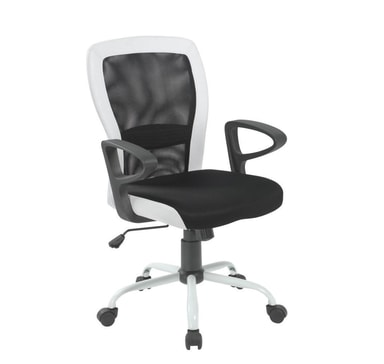 Arbetsstol LENO svart/vit. Sitsen och ryggstödet är klädda med svart polyestermeshtyg med vita konstläderkanter. Stolen har en lutningsmekanism. Lutningsspänningsjustering efter passagerarens vikt. Gaslyft säte höjdjustering. Armstöden är gjorda av svart plast. Den vita basen är gjord av stål, R30cm. Hjulen är gjorda av plast, stift: 11mm. Höjd 91-98,5cm, sitthöjd 46-53,5cm, sittdjup 47cm, sittbredd 47cm. Måtten på produkten är 60x57xH91-98,5cm. Viktkapaciteten är 120 kg.