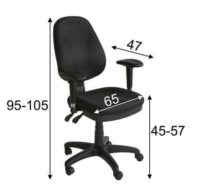 Arbetsstol SAVONA svart. Sits och ryggstöd är klädda med svart polyestertyg, 50 000 Martindale's. Ramen är svart. Pneumatisk sitshöjdjustering. Ryggstödets höjd och lutning är justerbara. Armstöden är gjorda av polyuretan. Armstödens höjd och avstånd är justerbara. Basen är gjord av svart nylon. Stolen har gummihjul, stift: 11mm. Höjd 96-108cm, sitthöjd 43-55cm, sittdjup 48cm, sittbredd 49cm. Måtten på produkten är 65x47xH96-108cm. Viktkapaciteten är 120 kg.