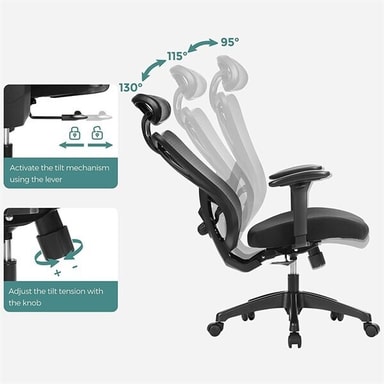 Ergonomisk kontorsstol med hjul – justerbart stöd och lutningsfunktion - Svart