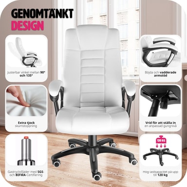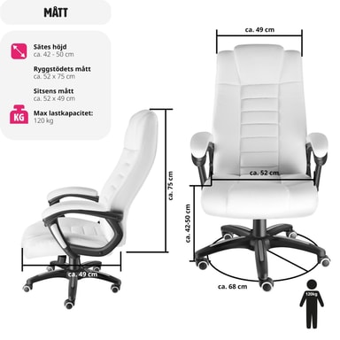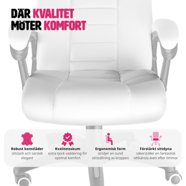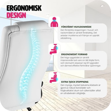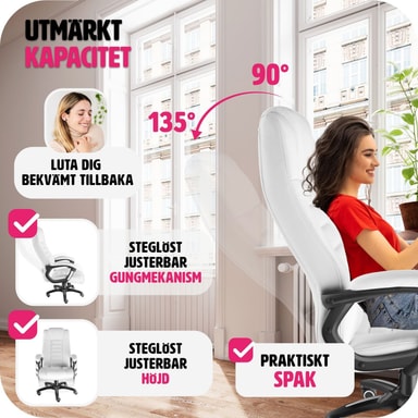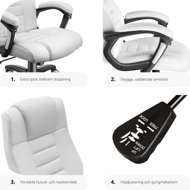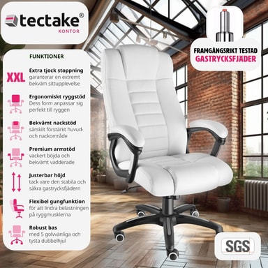 Denna lyxiga kontorsstol från tectake har extra tjock stoppning (upp till 12 cm) som erbjuder mjuk och ergonomisk sittkomfort! Vår kontorsstol har en välgjord och tät vaddering som bidrar till en lång livslängd. Sitsen, ryggstödet och den segmenterade huvudänden är skönt stoppade! Med stolens justerbara gasfjäder och dess bekväma, breda armstöd, hittar du alltid det perfekta läget. Uppgradera ditt kontor eller hem och ge alla dina möbler en upplyftande look. Beställ din nya kontorsstol från tectake redan idag!