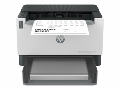 Upplev alla affärsinriktade funktioner och besparingar med HP LaserJet Tank 2504dw-skrivaren med upp till 5 000 sidor förfylld original HP-toner.