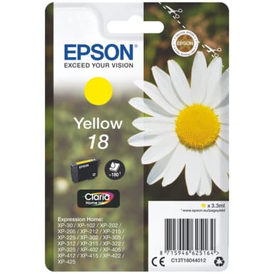 Ersättningspatron Epson Claria Home 18 bläckpatron innehåller färgämnebaserat bläck i färgen gul, för Epson Expression Home-serien av bläckstråleskrivare och ger upp till 180 sidor av utskrifter.Läs mer om produkten